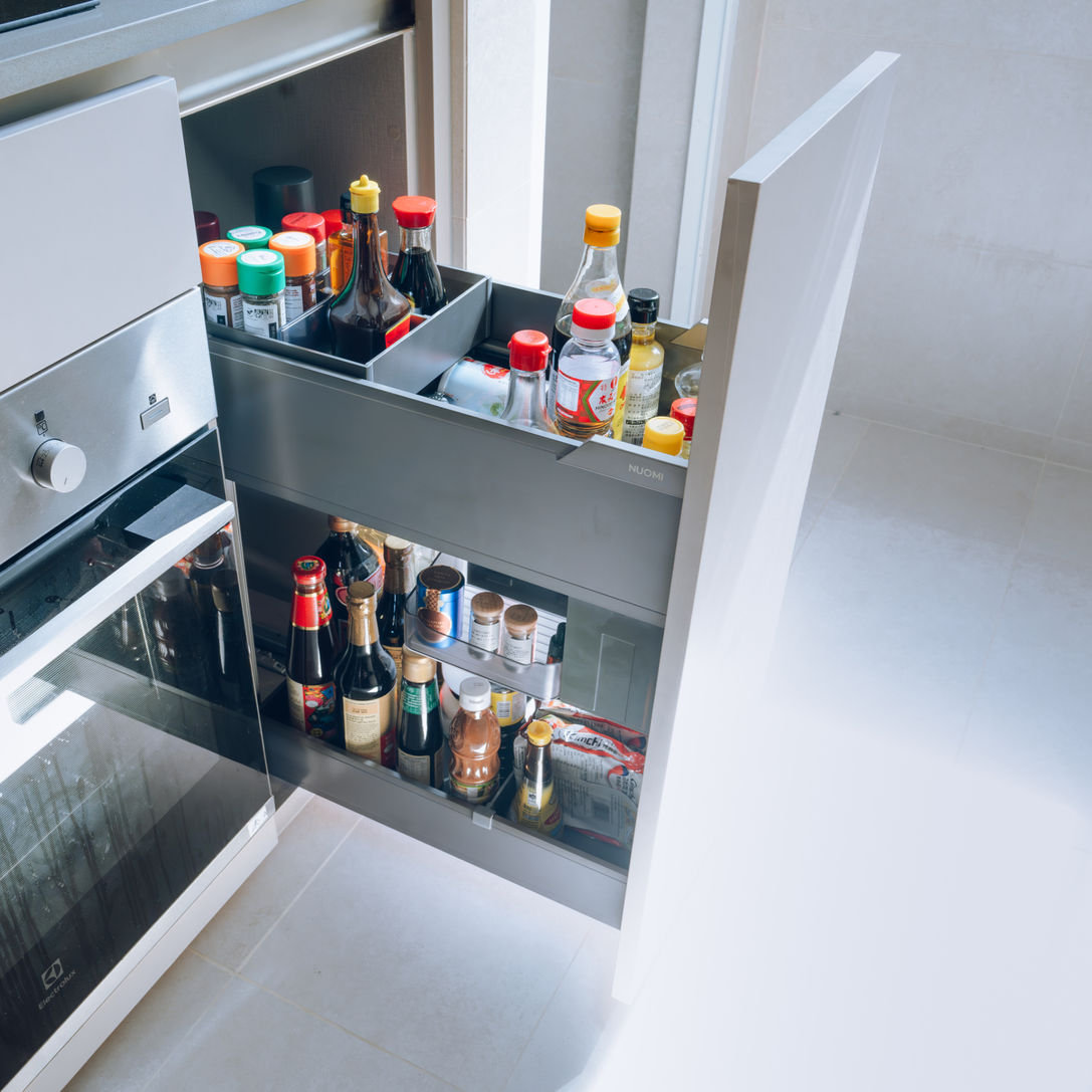 Keep your spices and cooking essentials perfectly organized with The Slider Slim. Designed for easy access, it features a compact pull-out mechanism with an additional slidable drawer for smaller items. A sleek solution for streamlined and efficient kitchen storage